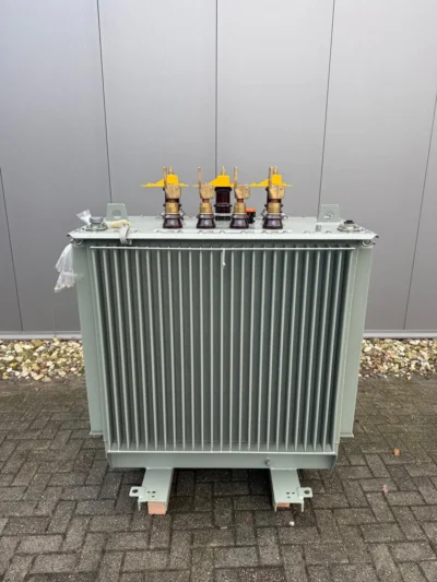Netherlands manufactured oil-filled 3 phase transformer. Originating from product year 2022 and built according to EN 60076-1 and Eco-design Tier 2. In used condition and directly available – 1 cover-mounted 5-position adjustment switch (± 2.5%; ± 5%), can be operated de-energized and padlocked – 3x 250 A / 24 kV porcelain bushings on cover – 4 LV Porcelain bushings for 630 kVA, swiveling rollers – 2 lifting and unhooking rings – 2 pulling eyes on frame – 2 ground terminals on cover (M12 studs), oil level and pressure protection relay – 1 draining device – 1 aluminum ratingplate.